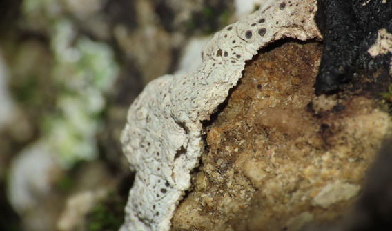 לפנינו חזזית לבנה בעלת יצע עבה מאוד, שממש יוצר תבליט חדש על-פני הסלע. בית מרכז החזזית והסלע לעתים נוצר רווח. אין עלעלים או קשקשים, וגופי-הפרי כה שקועים, עד שלא תמיד אפשר להבחין בהם מרחוק. זה ממש נראה כאילו מישהו טיפטף קצת צבע לבן סמיך על הסלע.