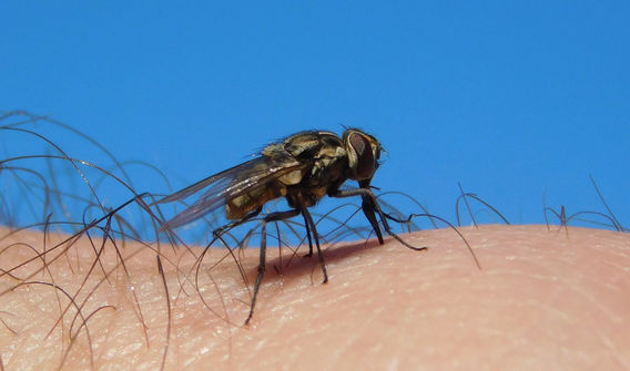 בעודי עומד ומצלם זבוב פיזוז על פרח, הרגשתי בדקירה בזרועי, והבנתי שבזה הרגע התווסף אל רשימת הביו-בליץ גם זבוב השוקיים (Stomoxys calcitrans), מין ממשפחת הזבוביים (קרוב של זבוב הבית), אצלו גפי הפה הלוקקות-מוצצות התפתחו לחדק חזק, המיועד לדקירה (אפשר לראותו כאן, נעוץ בבשרי). רימות זבוב השוקיים מתפתחות בחומר אורגני נרקב, בעוד הבוגרים משני הזוויגים ניזונים בדם יונקים ועופות. מחזור החיים כולו אורך שבועות ספורים. שילוב זה הופך את הזבוב המדובר למין נפוץ במשק החי ולמטרד אמיתי עבור חיות מבוייתות וחקלאים כאחד, במיוחד לאור העובדה שהמין יכול להעביר מחלות של סוסים, תרנגולות וחיות אחרות.