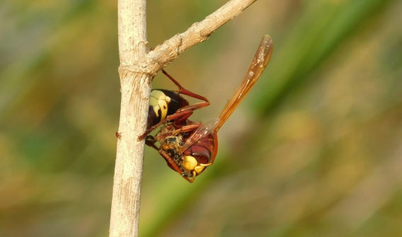 מצאתי את הצרעה המזרחית (Vespa orientalis) היפהפיה הזאת מנסה לאכול צוף מפריחת הברכיכיטון הצפצפתי (Brachychiton populneus). לפי הגודל, זאת כנראה מלכה צעירה, בשלב בו יש לה מעט זחלים ופועלות, והיא עוד צריכה לצאת מהקן וללקט מזון בעצמה.